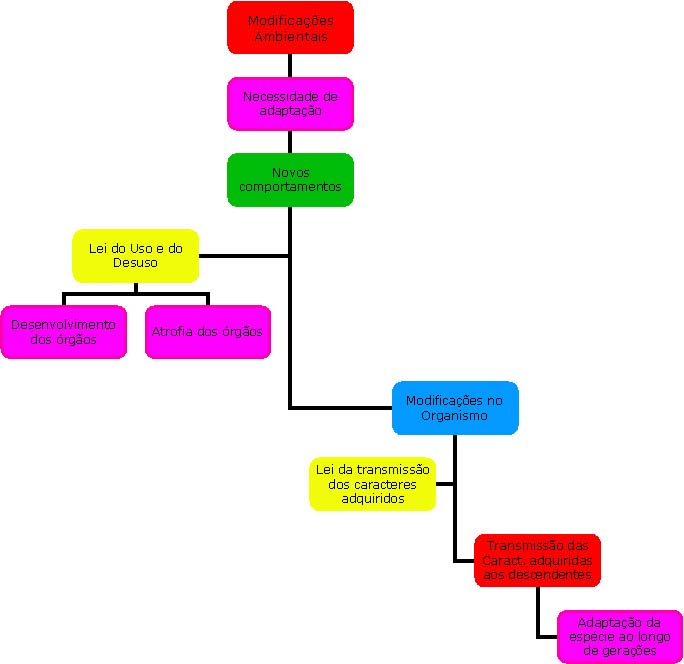 Lamarckismo - O meio é agente causador das modificações -> uma alteração do meio provoca nos seres vivos o aparecimento de novas características que lhes permitem a adaptação a esse ambiente - Lei do Uso e do Desuso - Lei da transmissão dos caracteres adquiridos