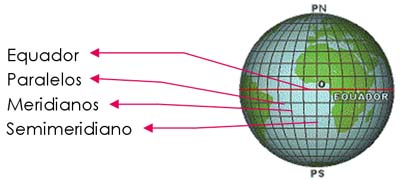 - Equador – é um círculo máximo, que divide a Terra em duas partes iguais, havendo o Hemisfério Norte e o Hemisfério Sul. - Paralelos – são círculos menores que o Equador, não dividindo a Terra em duas partes iguais. - Meridianos – são círculos que passam pelos pólos e são perpendiculares ao Equador, dividindo a Terra em duas partes iguais. - Semimeridiano – é um semicírculo, perpendicular ao Equador que vai de pólo a pólo; - Semimeridiano de Greenwich – divide a Terra em dois Hemisférios: . Hemisfério Ocidental (Oeste) . Hemisfério Oriental (Este)