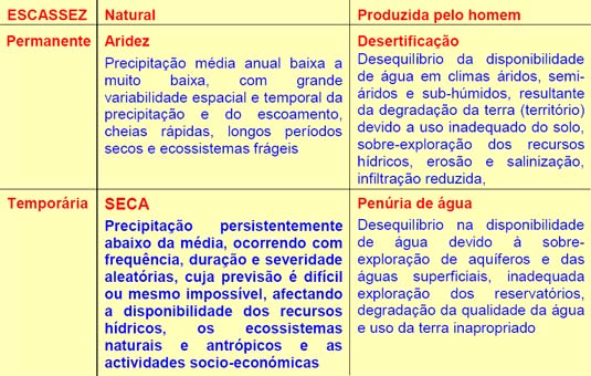Diferentemente de outros desastres naturais, os impactos das secas: . Não incidem sobre infraestruturas físicas mas sobre estruturas produtivas, ambientais e sobre a vida das populações; . São difíceis de quantificar e as provisões para a recuperação dos impactos são muito difíceis de realizar; . A severidade destes impactos não só dependem da duração, intensidade e dimensão espacial de dado episódio de seca e mas também da dimensão da procura para a água por parte das actividades humana e dos ecossistemas naturais e produtivos específicos das regiões onde ocorre a quebra de abastecimento hídrico.