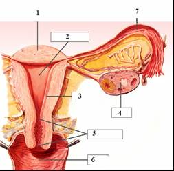 3. A: 1 - topo do útero; 2 – útero (corpo do útero); 3 – endométrio; 4 – ovário; 5 – colo do útero; 6 – vagina. B: 1 – canal deferente ou espermiducto; 2 – pénis; 3 – escroto ou bolsa testicular; 4 – testículo; 5 – próstata.