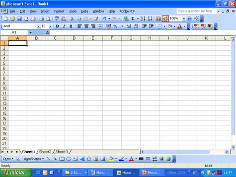 2. Janela do Excel Todas as aplicações desenhadas para Windows funcionam em janelas. O Excel funciona, portanto, numa janela de aplicação do Windows. Cada documento do Excel funciona, por sua vez, dentro de uma janela do Excel: uma janela documento. O Excel permite que vários documentos estejam abertos em simultâneo (em diferentes janelas documento), que se circule entre eles e que, inclusivamente, se copie ou transfira informação/dados de um para outro ou outros. Toda a janela do documento pode ser reduzida a um ícone ou maximizada para ocupar todo o espaço da janela da aplicação (neste caso do Excel). A figura seguinte mostra a janela aplicação do Excel e a janela documento activa (a de um documento cujo nome é Book1). Não corresponde, necessariamente, à normal utilização do Excel, mas permite compreender o modo de funcionamento do Windows e suas aplicações. A legenda que a acompanha referencia as zonas que, numa primeira abordagem, mais interessa conhecer.