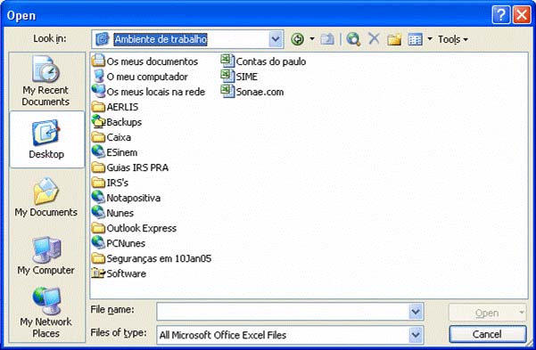 2. Abrir um documento Tal como qualquer outro documento criado com uma aplicação do Microsoft Office, um documento de Excel gravado antes pode ser aberto directamente através das janelas do Windows ou através do Windows Explorer, bastando para isso localiza-lo na unidade de disco e fazer duplo click no icon que o representa. Para abrir um documento gravado antes, quando já se está na aplicação Excel, deverá ser aberto o menu File e escolher a opção “Open”.