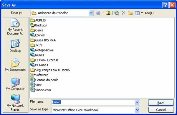 Se não for a primeira vez que o documento está a ser gravado, esta caixa de diálogo não surge quando se faz “Save” e o documento é gravado com o mesmo nome, o mesmo tipo e a mesma localização onde tenha sido gravado pela última vez. Se se pretender gravar uma nova versão do documento (uma versão com um nome diferente e/ou uma localização diferente e/ou um tipo diferentes) deve ser escolhida a opção “Save As” no menu File para que surja novamente a caixa de diálogo referida antes. Nessa caixa de diálogo pode ser então escolhida a nova localização e/ou nome e/ou tipo para o documento.