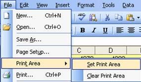 Área de Impressão De referir que é possível definir qual a área de impressão no interior da “Sheet” que se pretende imprimir. Para isso basta seleccionar a área a imprimir (por exemplo um quadro ou tabela) e de seguida escolher a opção “Set Print Area” existente na opção “Print Area” no menu File. Para anular a área de impressão existente, deverá ser escolhida a opção “Clear Print Area” ou definir nova área de impressão. No caso da área de impressão não estar definida, será imprimida toda a área da folha de cálculo que contenha células com conteúdo ou objectos.