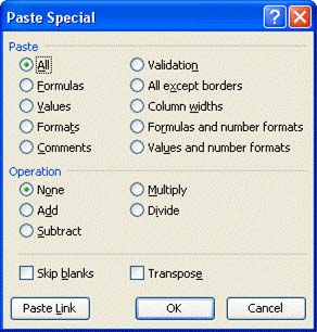 Para fixar a fórmula de forma a que este ajustamento não seja efectuado, deverá ser utilizado o símbolo “$” na referência à célula. Se por exemplo na fórmula colocada em C1 fosse fixada a referência a A1 (“=$A$1+B1”), quando esta fosse copiada para C2 ficaria “=$A$1+B2”.Existe ainda a possibilidade de fixar apenas a coluna (colocando o “$” apenas antes da letra identificativa da coluna, como por exemplo “$A1”) ou apenas a linha (colocando o “$” apenas antes do número identificativo da linha, como por exemplo “A$1”). Existe ainda uma segunda opção de colagem - “Paste Special” - disponível no menu Edit. Através da utilização da opção “Paste Special”, surge uma caixa de diálogo onde é possível alterar diversas opções de colagem do objecto ou do conteúdo da célula, como por exemplo colar apenas as formatações das células (opção “Formats”), os valores das células (opção “Values”), as fórmulas nelas contidas (opção “Formulas”) ou diversas combinações entre estes. É também possível copiar um valor para adicionar (“Add”), subtrair (“Subtract”), multiplicar (“Multiply”) ou dividir (“Divide”) numa outra célula: por exemplo se for copiada uma célula que contenha o número 5, quando for escolhida a opção “Add” na caixa de diálogo “Paste Special”, na célula de destino será acrescentado “+5” ao conteúdo que essa célula já contenha.