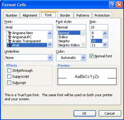 Escolhendo a referida opção, surge uma caixa de diálogo onde é possível aplicar as diversas opções de formatação, nomeadamente a formatação da fonte (representa o tipo de caractere), o estilo (normal, itálico, negrito ou negrito e itálico em simultâneo), a tamanho, o estilo de sublinhado, a cor e ainda diversos efeitos especiais (riscado, efeito potência, efeito índice, entre outos). Para aceder a estas opções de formatação, deverá ser escolhido o separador “Font” existente na caixa de diálogo.