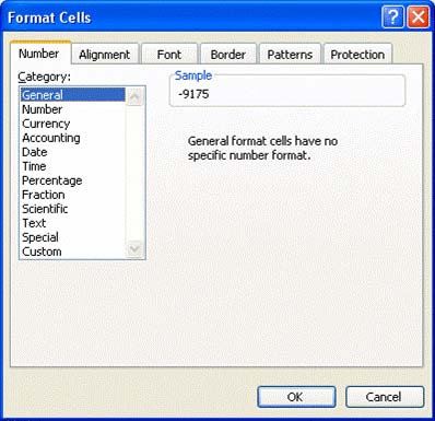 Esta caixa de diálogo apresenta diversas categorias de formatação, nomeadamente: - General: não atribui nenhum formato específico; - Number: permite definir o número de casas decimais, colocar o separador de milhares e definir o aspecto dos números negativos; - Currency: permite definir o número de casas decimais, adicionar um símbolo de moeda e definir o aspecto dos números negativos; - Accounting: idêntico ao anterior mas sem permitir definir o aspecto dos números negativos; - Date: apresenta os números em formato data – estão disponíveis diversos formatos de datas; - Time: apresenta os números em formato horário – estão disponíveis diversos formatos horários; - Percentage: coloca os números em formato percentagem e permite definir o número de casas decimais; - Fraction: apresenta os números em formato de fracção, permitindo diversas opções quanto ao número de dígitos; - Scientific: apresenta os números em formato científico e permite definir o número de casas decimais; - Text: o número contido na célula passa a ser considerado como texto e não como número; - Special: permite atribuir diversas formatações específicas para diferentes países (p.e. atribuir o aspecto de código postal); - Custom: permite ao utilizador definir a formatação de um forma totalmente flexível.