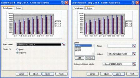No segundo passo do assistente (acedido através do botão “Next”) e no separador “Data Range” é possível definir a área onde estão localizados os dados que compõem o gráfico (se antes de se ter ido ao “Chart Wizard” se tiver seleccionado a área com os dados a incluir no gráfico, essa informação fica automaticamente definida no assistente não sendo necessária voltar a defini-la). Além da área, é também possível definir se os dados do gráfico estão em linha ou em coluna. Ainda neste segundo passo mas no separador “Series”, além de ser possível apagar e incluir novas séries no gráfico, é também possível definir as características das séries, nomeadamente os títulos a colocar nas legendas, as áreas da folha de cálculo onde estão os respectivos valores e a área onde está localizada a categoria do “X”. De referir que quando é definida a área com os dados a incluir no gráfico, o Excel automaticamente assume essa informação para definir as séries pelo que este separador do assistente seja utilizado para conferir alguma flexibilidade e permitir efectuar alterações.