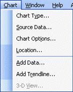 Formatação do Gráfico: Tal como para outros objectos, é possível alterar as características do gráfico após a sua construção. Para isso basta fazer click sobre o gráfico e aceder ao menu Chart que entretanto surge na Barra de Menus. Neste menu é possível, entre outras, enfectuar as seguintes operações: - Opção “Chart Type”: alterar o tipo de gráfico – por exemplo, alterar de gráfico de linhas para gráfico de colunas; - Opção “Source Data”: alterar os dados do gráfico, isto é, redefinir a área onde estão as séries e títulos que compõem o gráfico; - Opção “Chart Options”: alterar, os títulos, as legendas, e as grelhas; - Opção “Location”: alterar a localização do gráfico; - Opção “Add Data”: acrescentar novos dados ao gráfico; - Opção “Add Trendline”: acrescentar uma linha de tendência a uma das séries existentes no gráfico;