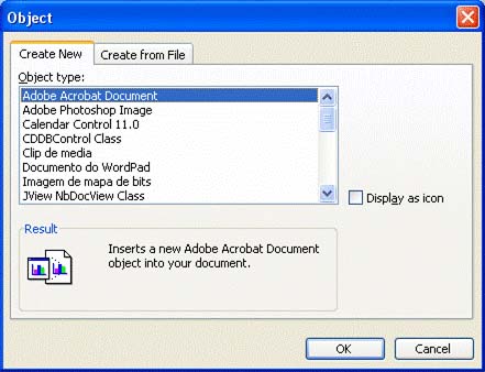 O Excel, tal como outras aplicações do Office, permite a inserção de diverso tipo de objectos, entre os quais: Imagens do Paintbrush; Documentos do Word; Imagens do “Clip Art”; Equações; Organogramas; Gráficos; Video Clips;… Para aceder aos diversos objectos proporcionados pelo Excel, deve ser escolhida a opção “Object…” no menu Insert. Ao escolher esta opção, é apresentada uma caixa de diálogo onde é escolhido o tipo de objecto a inserir no documento.