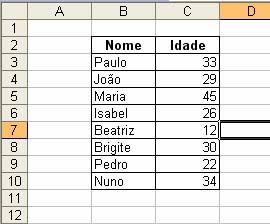 Através da opção “Sort” existente no menu Data é possível colocar por ordem alfabética ou por ordem crescente/decrescente uma determinada série de dados. Por exemplo, para colocar alfabética dos nomes a tabela abaixo, basta seleccionar toda a área da tabela, incluindo os títulos dos campos (“Nome” e “Idade”) e escolher a opção “Sort” no menu Data. De seguida, na caixa de diálogo que surge, é necessário identificar a série pela qual se presende efectuar a ordenação, optar por ordenação crescente ou decrescente e escolher a opção “Header Row”.