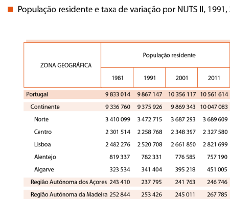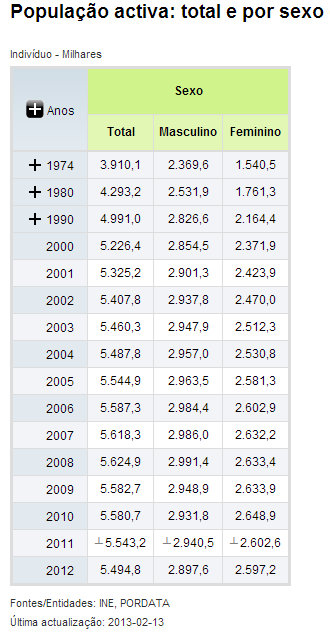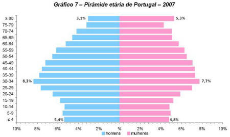 | | População A população portuguesa tem registado um aumento nos últimos dez anos. Os Censos de 2011 indicam que a população residente em Portugal é de 10.555.853 pessoas. Comparativamente com o ano de 2001 a população tem mais 200.000 cidadãos (10.356.117) . Em 1991, a população portuguesa era 9.867.147 pessoas. Em 1960 era de 8.889.392 pessoas. População Portuguesa por Género Dos 10.555.853 residentes, 52% são mulheres e 48% homens. Distribuição da população por grupos etários em 2011 · 65 anos ou mais - 18% · 15 anos ou menos - 15% Envelhecimento da População Portuguesa Há 40 décadas, a população portuguesa tinha mais jovens que idosos. Na primeira década do século XXI há mais idosos que jovens. Portugal é o oitavo país mais envelhecido da União Europeia. A imigração contribuiu para o crescimento da população portuguesa. Com a taxa bruta de reprodução dos portugueses a diminuir, a substituição de gerações em Portugal teve o contributo dos imigrantes. Imigrantes Legais em Portugal · 2010 - 443.055 pessoas · 2001 - 223.997 pessoas Portugal é o 17º país da União Europeia com mais população residente. Análise Regional  Estrutura etária  Natalidade em Portugal Portugal tem a mais baixa taxa de natalidade da UE A natalidade continua a baixar, situando-se agora em 1,36 crianças por mulher em idade fértil. Mas as cidades também não estão feitas a pensar nos menores e os pais não são apoiados, denunciam os peritos. A boa notícia é que a taxa de mortalidade infantil têm vindo a diminuir, sendo de 3,5 óbitos por mil nados-vivos. Números que se recordam a propósito do Dia Universal da Criança, amanhã, que celebra os 18 anos da Convenção dos Direitos da Criança. Os portugueses, tal como acontece nos outros países europeus, têm vindo a retardar a natalidade e a diminuir o número de filhos. A taxa de natalidade passou de 28% em 1935 para 10% em 2006. Ou seja, praticamente três vezes menos, o que significa que não está a ser feita a renovação de gerações, o que só é possível com 2,1 crianças por mulher. Para Mariano Ayala, médico de saúde pública do Hospital de Faro, uma média de 1,36 filhos por mulher em idade fértil é "sintoma de uma sociedade doente", considerando que "a sociedade portuguesa um comportamento suicida generalizado". Mariano Ayala justifica a quebra de natalidade com a falta de apoio para os pais e crianças. E a consequência é que "Portugal, com os portugueses de hoje, vai ter tendência a desaparecer", disse à agência Lusa. Os estudos demonstram que as mulheres retardam a natalidade até conseguirem estabilidade profissional. E, se em 1987, tinham os filhos antes dos 30 anos, nove anos depois, é no grupo dos 30 aos 34 anos que se verificam a maioria dos nascimentos. O primeiro filho deixou de surgir aos 26,8 anos para passar a ser aos 29,9. Movimentos Migratórios Evolução da população População portuguesa cresceu graças à imigração Está ultrapassada de vez a fasquia dos 10 milhões de portugueses como valor da população nacional. Diz o Instituto Nacional de Estatística, que somos 10 637,7 milhares e que crescemos graças à chegada de imigrantes, já que nascem cada vez menos bebés em Portugal. Os "Indicadores Sociais 2009", divulgados, hoje, quarta-feira, pelo Instituto Nacional de Estatística (INE), dão conta de um aumento de 10463 indivíduos naquele ano, face a 2008. Um crescimento que fica dever-se ao saldo migratório positivo de 0,1%, que compensou o saldo natural negativo. A taxa de crescimento natural foi, em 2009, de - 0,05% precisa o INE. Segundo o INE, nasceram em 2009 menos 5103 crianças do que em 2008, factor que fez regredir a taxa bruta de natalidade para os 9,4 nados-vivos por cada mil habitantes, quanto esse valor era de 9,8. As mulheres portuguesas têm menos filhos: por cada mulher em idade fértil nascem 1,32 crianças, valor que 12 meses antes era de 1,37. Daqui resulta o envelhecimento da população e o índice de envelhecimento, isto é, o número de pessoas com mais de 65 anos por cada 100 indivíduos com idades entre os 0 e os 14 anos, passou de 107 para 118. As famílias portuguesas são também menores, nota, ainda, o INE. É que apesar de a proporção das que têm filhos manter-se perto dos 56%, há cada vez mais famílias com apenas um filho. No ano passado, os portugueses casaram-se menos, quer pelo religioso, quer pelo civil, enquanto a idade média das mulheres ao nascimento do primeiro filho aumentou dos 27,4 para os 28,6 anos. População ativa  Estrutura da Produção PIB O BCE reduziu hoje sua previsão para o PIB da zona do euro e agora espera uma retração entre 0,6% e 0,2% na economia do bloco este ano. A estimativa anterior era de retração de 0,5% a crescimento de 0,3%. Para 2013, as projeções foram reduzidas para retração de 0,4% a expansão de 1,4%, sendo que antes a estimativa ia de crescimento zero a alta de 2,0% no PIB. O Banco da Inglaterra (BOE) manteve a taxa básica de juros em 0,50% e o programa de compra de ativos em 375 bilhões de libras, conforme o esperado. Em um comunicado o BOE informou que os nove membros do Comitê de Política Monetária do banco central votaram a favor da manutenção das políticas. Pib per capita | Grupos/Países | PIB per capita (PPS) | | Anos | 1995 | 2011 | | União Europeia (27 Países) | 14.740,9 | Pro25.133,2 | | Alemanha | 18.868,9 | Pro30.314,5 | | Áustria | 19.739,9 | Pro32.401,2 | | Bélgica | 18.861,7 | Pro29.678,5 | | Bulgária | 4.647,3 | 11.594,5 | | Chipre | 12.830,8 | 23.731,8 | | Dinamarca | 19.279,4 | 31.448,7 | | Eslováquia | 6.969,5 | 18.525,4 | | Eslovénia | 10.928,1 | 21.010,1 | | Espanha | 13.415,9 | Pro24.652,1 | | Estónia | 5.308,5 | Pro16.899,9 | | Finlândia | 15.776,6 | 28.795,4 | | França | 17.451,8 | Pro27.193,6 | | Grécia | 12.317,7 | Pro20.054,6 | | Hungria | 7.534,3 | Pro16.483,8 | | Irlanda | 15.184,4 | Pro31.908,6 | | Itália | 17.804,0