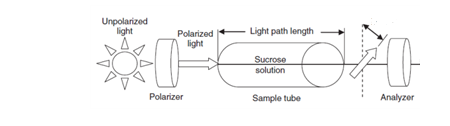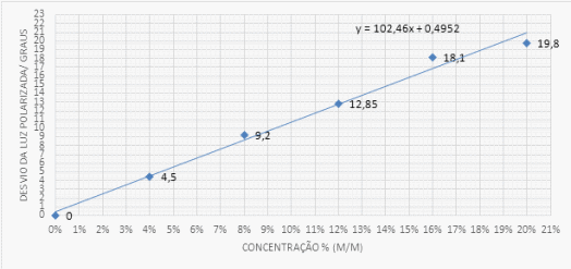 | Objetivos: A atividade laboratorial realizada na disciplina de monitorização ambiental teve como objetivo a determinação da quantidade de sacarose dextrogira no açúcar comercial por o processo de polarimetria. Introdução teórica: Existem diversos métodos óticos que se baseiam na relação entre uma propriedade ótica e a concentração, sendo um desses métodos a polarimetria.  A polarimetria tem por base a medição do desvio da luz polarizada. O campo elétrico e o campo magnético deste tipo de luz vibram num único plano onde se mantêm fixos e perpendiculares. A luz polarizada pode ser obtida passando a luz natural por um polarizador ou por uma substância polarizadora. Essa luz polarizada é utilizada para estudar a atividade ótica dos compostos orgânicos. A luz natural, por outro lado, comporta-se como um número infinito de ondas eletromagnéticas que vibram em todas as direções em torno do sentido de propagação.  Quando a luz polarizada atravessa uma substância oticamente ativa (substância em que a molécula não apresenta simetria, isto é quando a sua figura não coincide com a respetiva imagem num espelho plano) ela interage com milhões de moléculas causando um desvio angular que é proporcional ao percurso ótico l e à concentração C da substância.  Num polarímetro, além da fonte luminosa existem dois obstáculos constituídos por substâncias polarizadoras da luz, situados, respetivamente, antes e depois da câmara onde é introduzido o tubo com a substância opticamente ativa. O primeiro obstáculo é designado por polarizador e o segundo por analisador. Material: . Polarímetro; . Balança analítica; . Frasco de sacarose dextrogira (99% pureza); . Açúcar; . Balões volumétricos de 25,00 mL; . Espátula; . Gobelés; . Varetas. Procedimento . Preparar os padrões de trabalho de sacarose dextrogira com concentrações de 4%, 8%, 12%, 16% e 20% (m/m), dissolvendo a quantidade de substância calculada e colocando-a num balão volumétrico de 25,00ml; · Medir a propriedade física adequada recorrendo ao polarímetro; ·Preparar a amostra de açúcar comercial convenientemente, medindo uma massa que se encontre na média da dos padrões; · Medir a propriedade física da amostra; · Traçar a reta de calibração; · Com base no valor da propriedade física medida para a amostra calcular a % de sacarose (m/m) no açúcar comercial. Cálculos na preparação das soluções: ![]() ![]() ![]() ![]() ![]() Resultados | Padrões | Massa medida | Desvio da luz polarizada (graus) | | 4% | 1,0361g | 4,50 | | 8% | 2,1035g | 9,20 | | 12% | 3,0922g | 12,85 | | 16% | 4,1401g | 18,10 | | 20% | 5,0096g | 19,80 | | Amostra: | 2.7304g | 12,05 | Tratamento de dados  Cálculo da percentagem de sacarosa na amostra Desvio da luz polarizada na amostra: 12,05 Y=102,46x+0,4952 12,05-0,4952 = 102,46x x =0,113 % Sacarose na amostra= 11,3 Conclusão Através deste trabalho prático foi possível determinar uma percentagem aproximada de sacarose dextrogira presente no açúcar comercial, utilizando para isso um método ótico. O método ótico utilizado foi a polarimetria, para tal recorreu-se ao uso do polarímetro presente no laboratório, aparelho fácil de manusear e que proporciona uma análise bastante simples. Foi também permissível a comprovação que a sacarose não apresenta simetria já que foi capaz de ser analisada através deste método. A partir da observação do gráfico, posteriormente construído, é possível reconhecer o sucesso da execução da atividade, visto que a reta exposta no mesmo não apresenta uma distância notável dos pontos assinalados. Assim, e após efetuados os cálculos necessários, foi possível a descoberta de uma percentagem aproximada de sacarose na amostra analisada, sendo ela 11,3%. __________________________________ Outros Trabalhos Relacionados | | Ainda não existem outros trabalhos relacionados | |