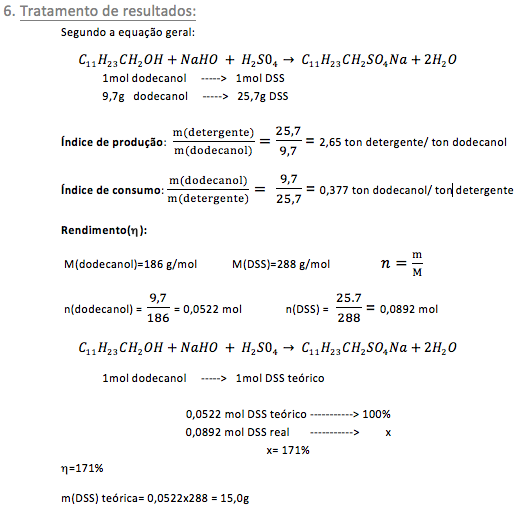 | Objetivos: Produção de um detergente realizando uma sulfatação, e posterior determinação do índice de produção e índice de consumo inerente ao processo desenvolvido. Será ainda calculado o rendimento da reação em questão. Introdução teórica: Este relatório foi redigido no âmbito da disciplina de operações e processos unitários, tendo como objetivo aprofundar os conhecimentos adquiridos sobre o detergente, assim como a total especificação do procedimento, resultados e conclusões envolvidos na produção deste composto. Um detergente é uma substância constituída por moléculas anfipáticas, isto é, moléculas que possuem uma camada hidrofílica ou polar e uma camada hidrofóbica ou apolar. Esta característica permite ao detergente interagir tanto com a água (parte polar) como com a gordura (parte apolar) facilitando a remoção da sujidade. A água, por si só, não é capaz de remover gorduras, como por exemplo o óleo, uma vez que estas substâncias tendem a aglutinar-se na sua presença (não se misturam, são imiscíveis. Assim, é necessário a utilização de um agente capaz de dissolver este género de sujidade, sendo esse a agente o sabão ou o detergente. A presença da porção hidrofílica possibilita a remoção destas gorduras através da espuma que se forma.  Hoje em dia, existe uma preferência por detergentes tanto em pó como em gel, já que estes representam uma alternativa mais barata e mais eficiente ao sabão. Este composto, ao contrário do que acontece com o sabão, oferece uma certa resistência à reação com as águas duras (águas mais mineralizadas, mais ricas em cálcio e magnésio) tendo consequências na formação de espuma, que é uma das características deste tipo de compostos que permite a remoção de substâncias gordurosas, diminui ainda o contacto que o detergente tem com a roupa, no caso das máquinas de lavar. O detergente produz-se realizando uma sulfatação. As matérias-primas usadas neste processo químico são: · Um álcool de cadeia longa; · Ácido sulfúrico concentrado; · Hidróxido de sódio concentrado. O detergente realizado pelos alunos na aula de operações e processos unitários, é um detergente bastante vulgar e que provém da reação entre o hidróxido de sódio (soda caustica), o ácido sulfúrico e o dodecanol. A equação química geral deste processo é a seguinte: Dodecil sulfato de sódio (DSS) Existem dois tipos de detergentes, os biodegradáveis e os não degradáveis, sendo que os biodegradáveis são aqueles que são facilmente transformados em matéria, por seres decompositores presentes na natureza, e por isso apresentam um menor impacto nos ecossistemas. Todos os seres vivos são prejudicados pelos constituintes dos detergentes, no entanto o ecossistema mais afetado é, sem dúvida, o aquático porque todos os resíduos provenientes das ações humanas chegam ao mar, tanto por esgotos como por lençóis de água. Materiais · Agitador magnético; · Balança analítica; · Funil de Buckner; · Papel de filtro; · Gelo; · Tina de vidro; · Vareta; Reagentes · Hidróxido de sódio a 25%(m/m); · Ácido sulfúrico concentrado; · Álcool de cadeia longa: dodecanol; Indicador: . Fenolftaleína. Instrumentos de medida . Provetas; · Gobelé de forma alta; · Num gobelé, de forma alta, adicionar, lentamente, 10 mL de ácido sulfúrico concentrado ao dodecanol, agitando durante 5 minutos (auxilio com agitador magnético); · Deixar a repousar durante 10 minutos; · Adicionar 40 mL de água destilada; · Adicionar hidróxido de sódio a 25% e colocar de novo no agitador magnético com uma agitação lenta até solução Procedimento: · Medir com uma proveta, aproximadamente 12mL de dodecanol (este composto poderá apresentar-se sólido devido às baixas temperaturas a que esteve exposto, será então necessário o seu aquecimento recorrendo a uma placa de aquecimento, ou outra fonte de calor, a fim da sua fusão); · Determinar a massa rigorosa da quantidade de dodecanol medida, e registar todos os algarismos fornecidos pela balança analítica; · Num gobelé, de forma alta, adicionar, lentamente, 10 mL de ácido sulfúrico concentrado ao dodecanol, agitando durante 5 minutos (auxilio com agitador magnético); · Deixar a repousar durante 10 minutos; · Adicionar 40 mL de água destilada; Adicionar hidróxido de sódio a 25% e colocar de novo no agitador magnético com uma agitação lenta até solução ligeiramente alcalina, que deverá ser indicada pelo auxílio da fenolftaleína que na presença deste tipo de meio passa de incolor a carmim; · Arrefecer até temperatura ambiente, utilizando para isso um banho de água e gelo numa tina de vidro; · Filtrar, sob pressão, a substancia obtida num funil de Buckner; · Secar e pesar; · Calcular índices de consumo e produção, assim como rendimento da reação. Resultados: Massa de dodecanol: 9,7g Massa de detergente obtida: 25,7g  Conclusão: Com a apresentação de várias ideias na introdução do relatório ficou explícito o conceito de detergente e a sua importância no quotidiano. Através do uso deste composto somos capazes de remover sujidades, particularmente gorduras, que na sua ausência seriam praticamente impossíveis de eliminar. Quando aos resultados, nomeadamente aos cálculos efetuados, foi possível a conclusão de que o detergente não secou completamente até ao momento de pesagem, uma vez que o rendimento da produção foi de 171%. Uma percentagem de 100% seria também pouco provável de ser obtida, visto que temos de considerar todas as perdas durante o processo, principalmente certas frações que ficam fixas às paredes do material de laboratório. Durante o trabalho não foi sentida qualquer dificuldade nem qualquer anomalia assim, podemos então concluir que a produção do detergente foi realizada com sucesso. __________________________________ Outros Trabalhos Relacionados | | Ainda não existem outros 