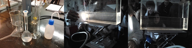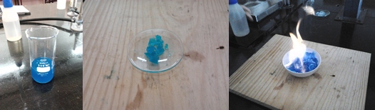 | Na aula de físico e química, foi-nos solicitado pelo professor a realização de uma experiência prático-laboratorial, em que se pretendia dar a conhecer aos alunos como se distingue soluções, coloides e suspensões, e o efeito de Tyndall. * Preparação de um gel por adição de uma solução saturada de acetato de cálcio a etanol: Uma solução é uma mistura homogénea (em que não se distinguem os componentes), constituída por um solvente (geralmente o componente em maior quantidade) e um ou mais solutos (substâncias que vão ser dissolvidas). Uma solução diz-se saturada se não se consegue adicionar mais soluto, ou seja, se o solvente não é suficiente para dissolver mais soluto. Esta atividade consiste em preparar uma solução saturada de acetato de cálcio, à qual será depois adicionado etanol. As substâncias que foram utilizadas na atividade pratico-experimental são os compostos designados por: . Acetato de cálcio- C4H6CaO4. Se um álcool é adicionado a uma solução saturada de acetato de cálcio, forma-se um gel semissólido inflamável; . Etanol (CH3 CH2OH), também chamado álcool etílico e, na linguagem popular, simplesmente álcool. Nesta experiência por falta desta substância utilizamos o álcool das lamparinas. * Efeito de Tyndall: Uma dispersão, em química, é considerada uma mistura, na qual, a olho nu não é possível identificar as diversas fases que a constituem. As dispersões podem classificar-se, conforme as dimensões das partículas da fase dispersa, podendo estas ser: · Soluções: dispersões cujo tamanho das partículas dispersas é menor que 1 nanómetro. Estas partículas podem ser iões, átomos ou moléculas. · Coloides (soluções coloidais): são misturas que apesar de conterem apenas uma fase são constituídas por duas ou mais substâncias e, quando observadas através de processos específicos é possível demonstrar que são constituídas por mais do que uma fase. Uma propriedade importante dos colóides é a sua dispersão da luz, ou seja, é possível observar o percurso de um feixe luminoso através de um coloíde, que se designa como: Efeito de Tyndall · Suspensões: são misturas de diferentes fases (heterogéneas): uma fase líquida e outra fase sólida ou gasosa que formarão geralmente uma solução uma solução aquosa. Os coloides apresentam dispersão da luz, ou seja, um feixe de luz visível ao atravessar a solução, este fenómeno do nomeado por Efeito de Tyndall, que ocorre devido à dimensão das partículas causadoras da dispersão da luz, são de maiores que o comprimento da onda da radiação que é dispersa. As substâncias que foram utilizadas na atividade pratico-experimental são os compostos designados por: * Tiossulfato de sódio ou hipossulfito de sódio, cuja fórmula é Na2S2O3, é um sal sólido e tem como característica- cristais de cor branca, muito solúveis em água. Que existe em laboratórios sob a forma de sal hidratado de fórmula química: Na2S2O3·5H2O; * Ácido clorídrico HCl- é uma solução aquosa que deve ser manuseada com precaução, por ser ácida e provoca queimaduras. Objetivos da experiência: Esta atividade pratico-laboratorial foi realizada por duas experiências, que tiveram como finalidade: * Preparar um gel, utilizando para isso uma solução saturada de acetato de cálcio (a preparar previamente), à qual se adiciona etanol. * Observar o efeito de Tyndall. Bem como dar a conhecer aos alunos como se processam e realizam as etapas necessárias à realização dos objetivos acima referidos Protocolo Experimental: Materiais: . Preparação de um gel por adição de uma solução saturada de acetato de cálcio a etanol: . Balança ± 0,01g (Matter Toledo; AB204; Max. 310g; Min. 0,02g) . Gobelé- 250ml (Boro 3.3) . Proveta- 10ml (Linex; 20˚C) . Espátula . Esguicho . Vareta de Vidro . Proveta- 100ml (±1; 20˚C) . Tábua de Madeira . Vidro de Relógio . Funil de Vidro . Fósforos . Efeito de Tyndall: . Tina regular- 500ml . Fonte de Luz . Vareta de Vidro . Elevador . Balão Volumétrico- 250ml (± 0.06ml; POLEX Portugal) . Proveta- 125ml (± 0.5ml; Nahita) . Gobelé- 600ml (Boro 3.3) . Balança ± 0,01g (Matter Toledo; AB204; Max. 310g; Min. 0,02 g) . Funil de Vidro . Esguicho com água Reagentes: . Preparação de um gel por adição de uma solução saturada de acetato de cálcio a etanol: Acetato de Cálcio Etanol . Efeito de Tyndall: Tiossulfato de Sódio- Na2S2O3 (aq) Ácido clorídrico- HCl Procedimento Experimental: . Preparação de um gel por adição de uma solução saturada de acetato de cálcio a etanol: * Preparação de uma solução saturada de acetato de cálcio: 1º. Nivelou-se a balança de precisão; 2º. Colocou-se o gobelé na balança, e com a ajuda da espátula, colocou-se pouca a pouco o sal em questão; 3º. Tentou-se obter um valor próximo do pretendido (3g); 4º. Registou-se o valor exato da massa desejado; 5º. Numa proveta, mediu-se 3,5ml de água e adicionou-se ao acetato de cálcio; 6º. Agitou-se a solução com uma vareta até o sólido se dissolver; * Preparação do gel 1º. Mediu-se 0,5ml de etanol numa proveta; 2º. Transferiu-se o etanol para o gobelé que contém a solução de acetato de cálcio; 3º. Colocou-se o vidro de relógio sob a tábua de madeira; 4º. Usou-se uma espátula para transferir um pouco de gel para o vidro de relógio; 5º. Acendeu-se um fósforo; 6º. Aproximou-se a chama cuidadosamente do gel; 7º. Observou-se e registou-se as conclusões; 8º. Retirou-se o vidro de relógio da tábua com uma pega, pela razão de estar quente; 9º. Procedeu-se à lavagem e arrumação de todo o material utilizado. . Efeito de Tyndal: * Pesagem do sal: 1º. Nivelou-se a balança de precisão; 2º. Colocou-se o gobelé na balança, e com a ajuda da espátula, colocou-se pouca a pouco o sal em questão; 3º. Tentou-se obter um valor próximo do pretendido (1, 25g); 4º. Registou-se o valor exato da massa desejado; * Dissolu