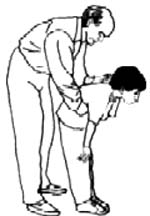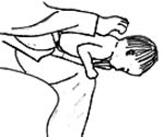 Situações de excepção à aplicação das compressões abdominais: . Mulheres grávidas . Vítimas obesas (nas quais o reanimador tem dificuldade em abranger o abdómen da vítima. Neste caso as compressões abdominais devem ser substituídas por compressões esternais que podem ser aplicadas em vítimas conscientes e inconscientes. . Crianças com menos de um ano de idade. Manobra de desobstrução das vias aéreas em crianças (<1 ano) - Manobra de Heimlich 1. Observe se a criança consegue chorar, tossir ou respirar. Se a resposta é negativa, prossiga para o passo seguinte. 2. Coloque a criança de barriga para baixo (decúbito ventral) sobre o seu antebraço com a cabeça inclinada para baixo, efectue 5 pancadas nas costas, na linha média entre as omoplatas (utilize a base da mão, com força adequada ao tamanho da criança).