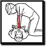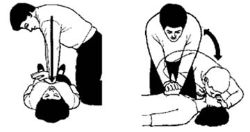 3. Se as pancadas falharem, coloque a sua mão fechada em punho e com o polegar contra o abdómen da vítima, entre o umbigo e o apêndice xifóide, na zona do epigastro. Com a outra mão envolver o punho fechado e efectuar cinco compressões abdominais para dentro e para cima. Devem ser pausadas, seguras e secas (Manobra de Heimlich). Verifique se o corpo saiu pela boca. Repetir esta sequência de pancadas nas costas e compressões as vezes que for necessário até à expulsão do próprio objecto. Vítimas inconscientes Se a vítima estiver inconsciente e não conseguir suportar o seu peso, deve colocar a vítima deitada sobre as costas e iniciar a ressuscitação cardio-pulmunar, verificando se algum corpo estranho é expelido removendo-o da boca se necessário. Repetir esta manobra até que seja eficaz.