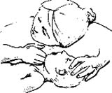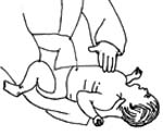 3. Alternadamente, coloque-a de costas (decúbito dorsal) e se necessário sobre uma superfície dura, execute 5 compressões sobre o esterno, com dois dedos, ou com os polegares ficando os restantes dedos a envolverem o tórax da criança. As compressões devem ser executadas abaixo da linha média intermamilar. Estas devem ser pausadas e seguras.