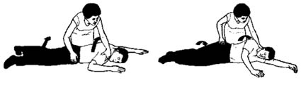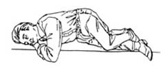 5. Continue com 2 insuflação para 30 compressões. Após dois minutos de repetir este ciclo ligue 112. Volte para junto da criança e continue até chegar ajuda. Se observar sinais de circulação, mantenha ventilação, uma de 3 em 3 segundos e pare as compressões. 6. Se a vitima reassume a respiração e readquire pulso coloca-la na Posição lateral de segurança. Posição Lateral de Segurança (PLS) Excepto nos casos de suspeita de fractura da coluna vertebral ou do pescoço, se a vitima respirar, coloca-la na posição lateral de segurança. Esta posição permite um boa observação e acesso á via aérea assim como uma boa drenagem de fluidos pela boca. 1. Ajoelhar-se ao lado da vítima, alinhar-lhe os membros e alargar o vestuário. 2. Colocar o braço mais próximo dobrado ao nível do cotovelo 3. Encostar as costas da outra mão da vítima na bochecha. 4. Flectir a perna da vítima do lado mais afastado. 5. Com uma mão a apoiar a cabeça e a outra a apoiar a perna rodar lentamente o corpo 6. Puxe a testa da vítima para trás, de modo a que a garganta fique direita. Assim, as vias respiratórias manter-se-ão desimpedidas, o que permite que a vítima respire livremente.