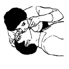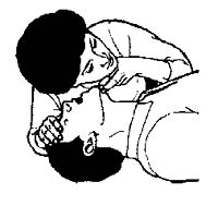 8. Execute ventilação artificial. Mantendo a via aérea aberta (extensão), tape o nariz abrindo a boca e execute respiração boca-a-boca (duas insuflações de modo a elevar o tórax da vítima, cerca de 1 segundo cada). A ventilação pode ser executada com "máscara de bolso", insuflador manual, etc. No caso de não ter nenhum destes aparelhos pode usar um lenço como filtro por motivos de higiene.