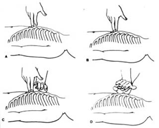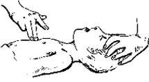 5. Se não ventila normalmente ligue 112. 6. Posicione as mãos. A compressão torácica externa deve ser realizadas sobre a metade inferior do esterno da vitima, em decúbito dorsal. Deslize os dedos indicador e médio pelo rebordo costal até o entalhe onde as costelas encontram o esterno. O dedo indicador é posicionado ao lado do médio, na extremidade inferior do esterno. A base da outra mão é colocada no esterno ao lado do dedo indicador da outra mão, que seguidamente é apoiada sobre a mão apoiada no esterno de tal maneira que fiquem paralelas entre si, entrelaçando os dedos. Os dedos da mão que está por cima puxam os da que está por baixo assegurando que não é exercida pressão destes sobre as costelas.