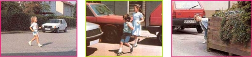 Figs.5,6 e 7 – Crianças em perigo na via pública. Fonte :http://www.junior.te.pt/servlets/Rua?P=Sabias&ID=203(15/05/2009) A criança e o trânsito - O papel dos pais Os pais desempenham um papel fundamental no desenvolvimento da criança, por isso mesmo é importante que lhes ensinem as regras básicas a ter como peões. Apesar de poderem andar na rua sozinhas, não o devem fazer sem a presença de um adulto. As crianças, consoante a idade, comportam-se de maneira diferente, nem todas têm a mesma percepção quando se deparam com o perigo na rua. Posto isto, iremos demonstrar o seu desenvolvimento de uma forma sintetizada: Até aos 5 anos: as crianças não têm noção dos perigos que as rodeiam quando saem à rua. A sua única preocupação é brincar e, muitas vezes, é assim que se interpretam os avisos dos pais: “é mais uma brincadeira”. Desta forma, nunca devem estar sem vigilância ou sair sozinhas à rua. Após esta idade, a criança está mais atenta ao que lhe rodeia, notando-se uma evolução dos seus <<sensores de trânsito>>, mas deve na mesma andar sempre vigiada por um adulto.