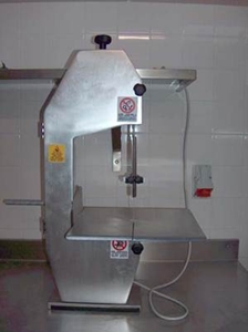 Imagem: Serra de fita destinada ao corte de alimentos . Evitar permanecer muito tempo em pé, alternando as posturas de pé e sentado . Colocar nos postos de trabalho, onde exista uma permanência durante longos períodos de tempo em pé, tapetes anti – fadiga . Utilizar calçado confortável, de preferência com palmilhas anti – fadiga Riscos Biológicos As situações que podem colocar os trabalhadores em contacto com organismos patogénicos são: . Manipulação de alimentos crus ou contaminados . Utilização de farinhas ou outros produtos em pó Medidas de Prevenção . Reduzir a produção de poeiras em suspensão (não deitar ao alto produtos de grão muito fino, como é o caso das farinhas; verte-los cuidadosamente sobre as superfícies onde vão ser utilizados de forma a evitar a formação de partículas em suspensão) . Evitar peneirar farináceos (adquirir produtos refinados) . Substituir, caso seja possível, produtos em pó por produtos granulados . Manter o local de trabalho bem ventilado e limpo (evitar a acumulação de poeiras) . Manusear os alimentos com luvas . Disponibilizar baldes do lixo accionáveis por pedal, de forma a evitar o contacto com os mesmos ao eliminar os desperdícios