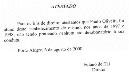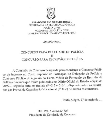 êxito. - Oficio - Aviso - As notificações - Memoriais - Petições - Requerimentos - Procuração - Protocolo - Atestado - Certidão - Certificação - Anúncio - Edital - Leilões - Hastas públicas Espero desde então, ser explícita mas breve, acompanhando sempre cada conceito a um definição. OfícioO ofício é tipo de correspondência externa muito usado, especialmente quando o destinatário é órgão público. Ele serve para "informar, encaminhar documentos importantes, solicitar providências ou informações, propor convénios, ajustes, acordos, etc., convidar alguém com distinção para a participação em certos eventos. O modelo moderno de estruturação de ofício é: 1. Timbre (se houver) 2. Três espaços duplos 3. (À esquerda) Número do ofício. (Na mesma linha, na posição centro direita) Local e data 4. Um espaço duplo 5. Epígrafe 6. Dois espaços duplos 7. Vocativo (Prezados Senhores, Excelentíssimo Senhor Ministro,) 8. Três espaços duplos 9. Corpo do texto 10. Dois espaços duplos 11. Fecho 12. Três espaços duplos 13. Assinatura acima do nome, abaixo do qual aparece o cargo ou função 14. (Mais abaixo, à esquerda) Endereçamento: nome e cargo ou apenas o cargo do destinatário, endereço postal completo 15. Iniciais de quem redigiu e as de quem dactilografou/digitou, separadas por barra (/).