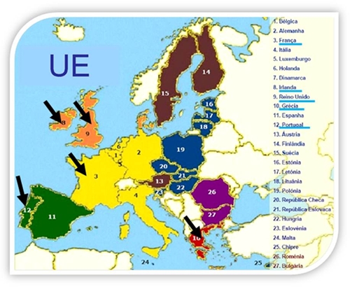 IntroduçãoEste trabalho surgiu no âmbito da disciplina de Economia, último módulo deste ano lectivo, e tem como finalidade abordar assuntos relativos à Economia Portuguesa no contexto da União Europeia. O nosso trabalho, num sentido mais restrito, aborda de forma simplificada as Relações Económicas com o exterior. A integração é um fenómeno comum no mundo. Quase todas as grandes economias mundiais encontram-se, de alguma forma, envolvidas em processos de integração económica. Por exemplo, os Estados Unidos (NAFTA), Europa (União Europeia), América latina (Pacto Andino e MERCOSUL). Desde 1945, a construção da Europa encontrou-se constantemente ao centro da política estrangeira francesa. A prioridade desta iniciativa era a vontade de acabar com os conflitos que, por duas vezes em trinta anos, rasgaram o continente europeu e diminuíram a França, a necessidade, na sequência da guerra fria, de iniciar a estabilidade e de garantir a segurança dos Estados democráticos situados a Oeste da cortina de ferro e a preocupação de construir um espaço económico, adaptado às condições modernas de produção, garantindo a prosperidade dos povos europeus. Assim, para um crescimento próspero e saudável da Europa, criaram-se vários Tratados ao longo dos tempos, os quais iremos abordar de forma simplificada, de modo a haver uma plena harmonização, e que os esforços sejam com a colaboração de todos os países/Estados-Membros pertencentes à União Europeia. Tal como os Tratados evoluírem, foi também evoluindo o número de países pertencentes à U.E. estando hoje nos 27 Estados-Membros. Devido à adesão de vários países à União Europeia, pensou-se que seria mais fácil a adesão a uma moeda única – o Euro – trazendo vantagens tais como fortalecer a economia europeia e aumentar a sua competitividade a nível internacional, eliminar as distorções dos preços provocadas pelas flutuações cambiais, facilitar a comparação do preço dos bens nos diferentes países da zona euro, permitir viajar sem a preocupação de trocar dinheiro, permitir poupar nas comissões cambiais e na diferença entre a compra e venda de moeda, etc. Foi assim, o culminar de todo o processo de construção da União Económica e Monetária (UEM) constituindo o grande objectivo previsto no Tratado de Maastricht. Tratando-se de políticas económicas, foi necessária a criação de uma entidade independente ou ligada ao Estado que gere essa política económica, ou seja, que garanta a estabilidade e o poder de compra da moeda de cada país e do sistema financeiro como um todo. Estamos obviamente a falar do Banco Central Europeu. No âmbito da troca com o exterior, abordaremos as importações e exportações, os parceiros económicos e os produtos exportados. Como amostra, limitamo-nos à escolha de cinco países dos quais: Portugal, Reino Unido, França, Irlanda e Grécia, abordando a sua área geográfica, uma breve abordagem respeitante a cada país, a sua população, qual a sua capital, língua oficial, moeda utilizada e a partir de que data aderiu à União Europeia. Esperamos que o nosso objectivo de esclarecer uma pequena, mas importante parte de países respeitantes a União Europeia, seja atingido, contribuindo para uma melhor percepção dos variados temas relacionados com a União Europeia. Portugal