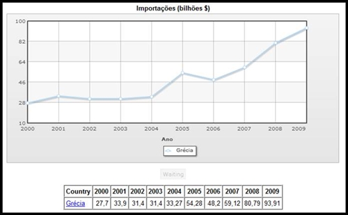 De acordo com este gráfico, podemos observar, que de uma forma geral as importações relativamente à Grécia têm aumentado. Apesar de verificar uma pequena diminuição do ano de 2001 para 2002, voltando a aumentar e posteriormente voltando a diminuir, desde o ano de 2005 até o ano de 2006. Sendo que se inicia com um valor de importações de 27,7 em 2001, sendo este o valor mais baixo relativamente aos restantes anos em comparação e termina com um valor de importações de 93,91 em 2009.