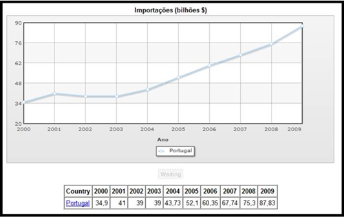 Relativamente a Portugal temos a oportunidade de assistir a um aumento progressivo das importações desde o início do ano de 2000 até o ano de 2009. Apesar de ser notória uma pequena diminuição no valor das importações entre o ano de 2001 e o ano seguinte, 2002 voltando pois a aumentar até o ano final da amostra. Atingindo assim o valor mais baixo de importações de 34,9 no ano de 2000, contrastando com o valor mais elevado, visível no ano de 2009, com 87,83.