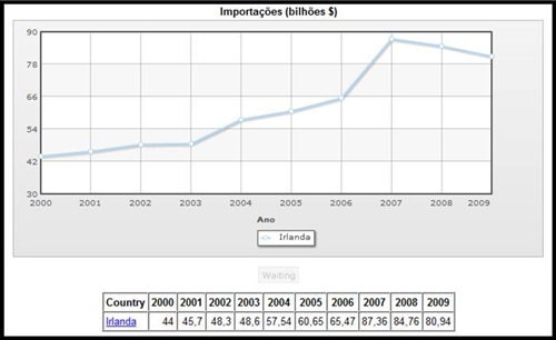 Relativamente à Irlanda, verificamos que o valor das importações tem aumentando desde o ano de 2000 até o ano de 2007 em que é possível repararmos numa quase estabilização das importações no ano de 2002 para o ano de 2003 , verificando-se que posteriormente, que o valor de importações neste país diminui de uma forma mais notória até ao ano de 2009. Atingindo pois, o valor de importações mais baixo, no ano de 2000, com 44 bilhões e o valor de importações mais elevado no ano de 2007 com 87,36 bilhões.