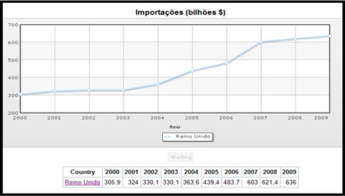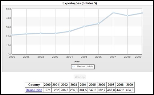 O Reino Unido apresenta sempre uma subida progressiva. Não chegando a atingir o patamar da França (601.9 bilhões de dólares), apresenta valores que vão aumentando desde 2000 iniciando-se em 271 bilhões de dólares, até 2007 com 468.8 bilhões de dólares verificando-se uma pequena descida para 442.2 bilhões de dólares em 2008, mas o qual foi reposto em 2009 com 464.9 bilhões de dólares em termos de exportações.