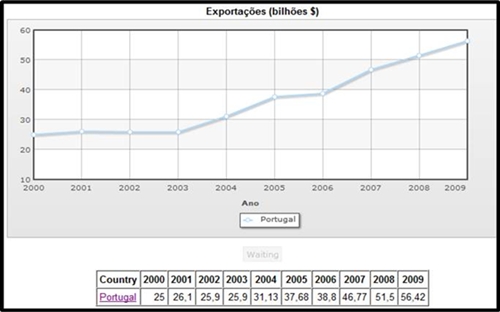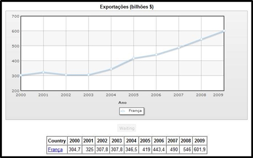De acordo com este gráfico, podemos concluir que a França no ano 2000 para 2001 teve um aumento de mais de 10% nas exportações, o qual não se verificou nos anos seguintes pois houve um decréscimo total, pois passamos de 325 bilhões de dólares para 308 bilhões de dólares. Nos anos seguintes há um crescimento não muito lento, obtendo assim uma evolução do ano 2002 em que conseguiu 308 bilhões de dólares, para o ano 2005 chegando aos 419 bilhões de dólares. A partir do ano 2005, as exportações evoluíram bastante atingindo os 602 bilhões de dólares em 2009.