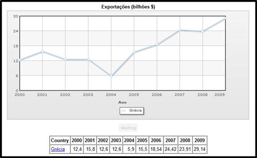 Em relação à Grécia, país pobre em termos de exportações nunca conseguiu atingir mais de 30 bilhões de dólares o que comparando neste momento com a França, não chega a ser a metade. Ao longo dos anos a Grécia não apresenta resultados regulares. De 2000 para 2001 há um decréscimo de 3.4 bilhões de dólares, o que para países como a França não é muito, mas para países como a Grécia já é relevante. A mais acentuada descida realiza-se no ano 2004, passando de 12.6 bilhões de dólares para 5.9, uma diferença de 6.7%. No entanto, para bom dos gregos, apenas se efectivou essa descida nesse ano pois nos anos seguintes, conseguiu atingir um valor de exportações superior ao do ano 2001, sendo em 2007 um valor de 24 bilhões de dólares aproximadamente, em 2008 com uma pequena descida – 23.91$ - atingindo em 2009 os 29.14 bilhões de dólares.