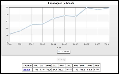 A Irlanda, não apresenta valores tão agradáveis quanto a França, mas também tão angustiantes como a Grécia. Assim podemos dizer que á excepção do ano 2006 em que houve uma diminuição de 103.8 bilhões de dólares para 102 bilhões de dólares, a Irlanda aumentou o seu nível de exportações desde 2000 até 2009, iniciando-se em 66 bilhões de dólares, até em 2009, atingindo os 119.6 bilhões de dólares.