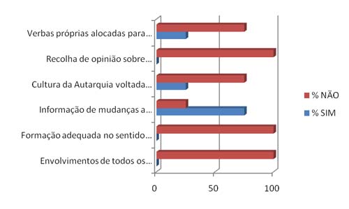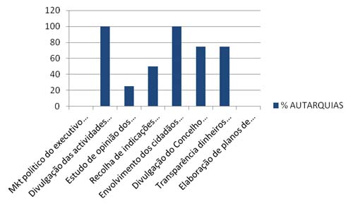Gráfico 5 – Distribuição percentual de respostas quanto á utilização de sistemas de comunicação interna Fonte: Questionários Competências Autarquicas na área do Marketing As competências das autarquias na área do marketing são práticamente inexistentes, são poucas as que têm verbas alocadas directamente para campanhas de marketing e as politicas de marketing não estão devidamente implementadas, devido á falta de formação adequada dos funcionários, no sentido de potenciar essas acções. Todos os trabalhadores compreendem a sua importância para a relação de proximidade com a população, mas a falta de formação adequada e o não envolvimento de todos os serviços, nas formas de marketing que estão a ser desenvolvidas, é do ponto de vista da comunicação interna um obstáculo que deve ser combatido. Para efeitos de elaboração dos planos orçamentais anuais, as autarquias deveriam recolher a opinião sobre as necessidades e prioridades dos municipes e raramente isso acontece. Dada essa informação, estamos novamente perante mais uma barreira à comunicação. A informação obtida através de estudos de opinião junto da população, pode reduzir erros de investimento público em serviços que náo são de momento uma prioridade e reencaminhar esse investimento para o que pode ser o mais valia para o municipio.