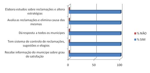 Gráfico 2 – Distribuição percentual de respostas quanto às práticas utilizadas pelas autarquias relativamente a estudos de opinião Fonte: Questionários Tratamento de Reclamações A intervenção do munícipe na vida activa da autarquia é sem dúvida de elevada importância e as autarquias já o valorizam, dada a totalidade de respostas positivas obtidas no questionário. Já se fazem controlos de reclamações no sentido de avaliar as causas e eliminá-las, assim como fazer uso das sugestões dos munícipes para melhoria e implementação de novos serviços, já é uma prática adoptada em algumas ocasiões. A comunicação com e á população, já se faz cada vez mais e um exemplo disso é a resposta ao munícipe por parte da autarquia, sempre que aí se dirige. É de salientar também a preocupação já existente, em elaborar estudos sobre as reclamações, no sentido de alterar estratégias ou prioridades de actuação, se bem que de forma geral há ainda muito a fazer nesse sentido e um exemplo disso é a quase inexistente valorização da opinião da população na aplicação de dinheiros públicos no Concelho. O que a população diz ser prioritário nem sempre é ouvido por parte da Câmara.