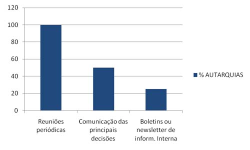 Gráfico 4 – Distribuição percentual de respostas quanto às formas de divulgação junto da população Fonte: Questionários Comunicação Interna A comunicação interna é o que concluímos ser o ponto mais fraco de todas as autarquias questionadas. A falta de comunicação entre departamentos e o pouco envolvimento dos funcionários nos projectos em curso quase não existe. Não só os trabalhadores não conhecem na sua grande maioria os objectivos estratégicos da autarquia, assim como os trabalhadores que vão estar envolvidos em novos projectos, não são alvo de informação e explicação. Trabalhador satisfeito, é muitas vezes sinónimo de uma melhor prestação de serviço e logo mais um cidadão satisfeito. Mas parece que muitas autarquias se têm esquecido disso, e os estudos sobre o grau de satisfação dos trabalhadores não é efectuado com periodicidade. Os resultados destes estudos quando elaborados, podem ser alvo de análise para posterior rectificação de erros por parte da autarquia. Os meios mais utilizados ainda são as reuniões periódicas e mais recentemente a utilização de meios electrónicos através de email. Seria necessário implementar novos meios de comunicação e adoptar novas políticas de comunicação interna, a fim de melhorar não só a eficiência do próprio serviço, com uma maior proximidade de departamentos e ideias, mas também prestar um melhor esclarecimento ao munícipe das actividades da autarquia.